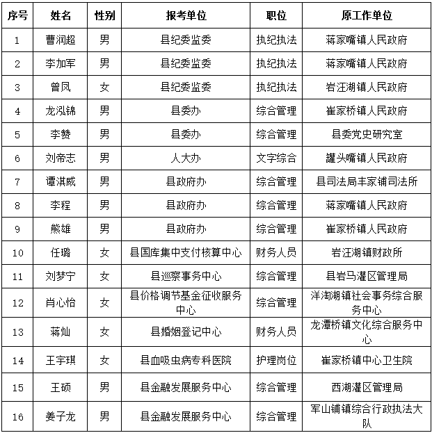 根据《汉寿县2026年公开选调(选聘)工作人员(第一批)公告》,经报名、资格审查、考试、考察等程序,确定曹润超、李加军等16名同志为第一批拟选调(选聘)人员,现予以公示。公示期为2026年3月13日至3月19日,共5个工作日。具体名单如下: