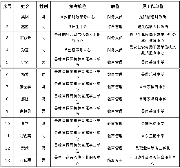 根据《汉寿县2026年部分单位公开选调(选聘)工作人员(第二批)公告》,经报名、资格审查、考试、考察等程序,确定粟闯等13名同志为第二批拟选调(选聘)人员,现予以公示。公示期为2026年4月9日至4月15日,共5个工作日。具体名单如下: